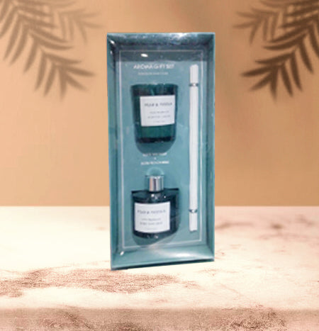 Indulge your senses or gift a moment of calm with our Aroma Gift Set, featuring a luxuriously scented candle and elegant reed diffuser in the refreshing Pear + Freesia fragrance.