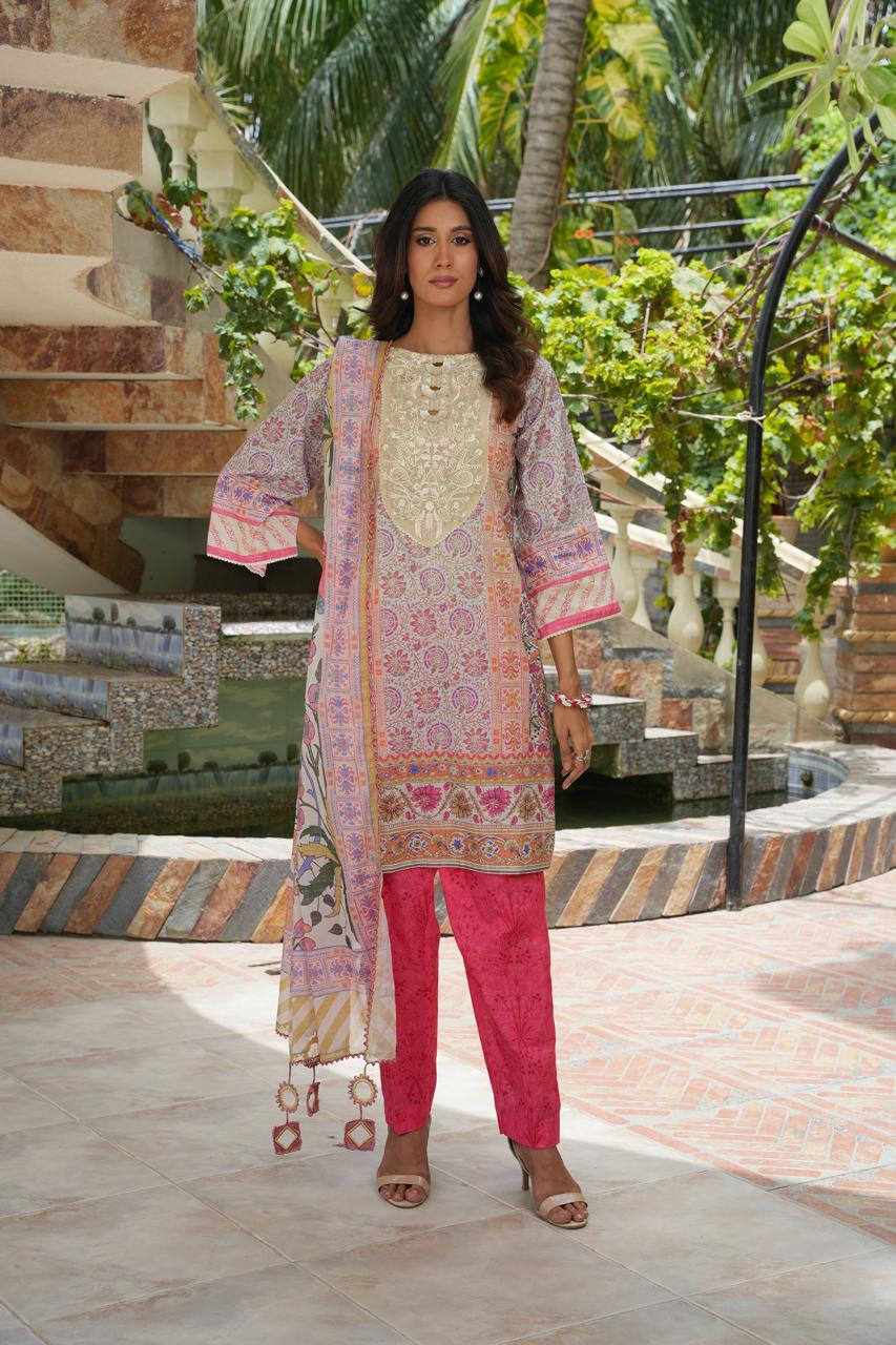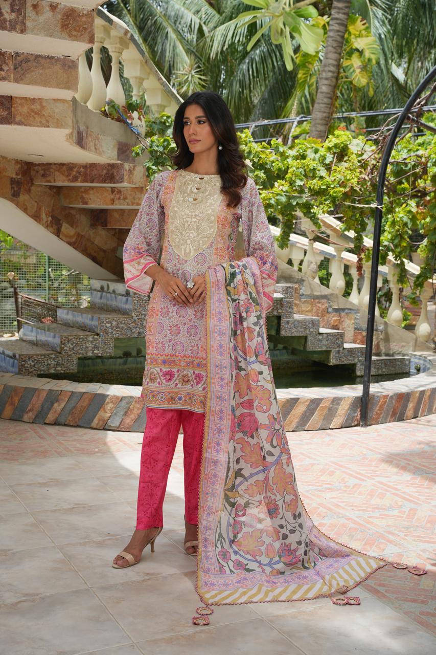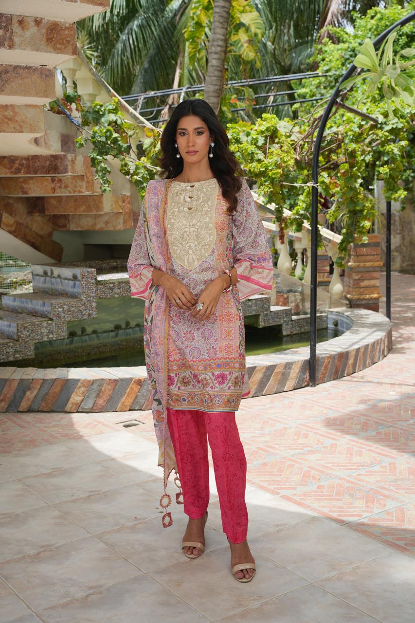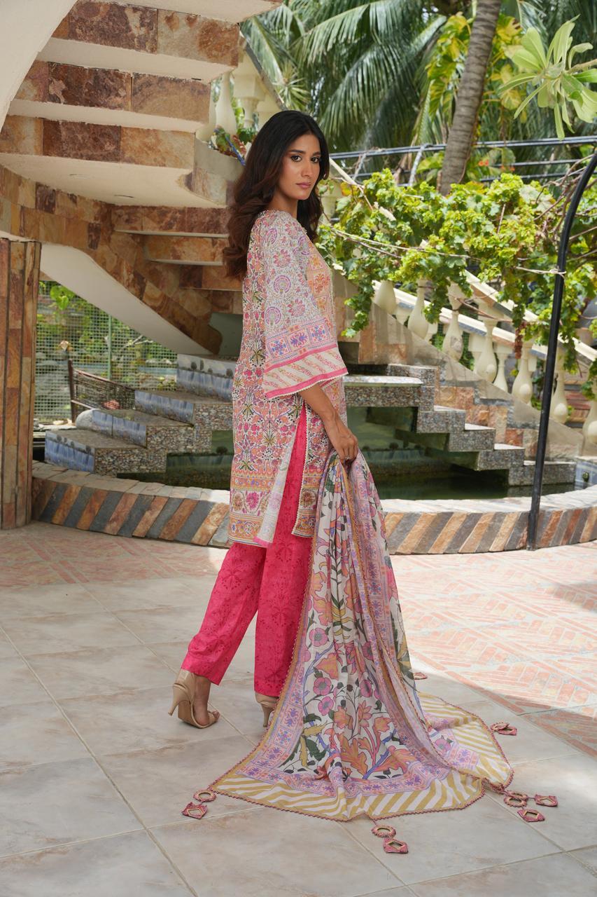 The digitally printed shirt features intricate motifs and lively patterns that celebrate summer’s charm, while the bold pink trouser adds a striking contrast to enhance the overall aesthetic. Completing the ensemble is a flowy printed dupatta, detailed with ornate borders and festive tones, radiating timeless grace and cultural beauty.