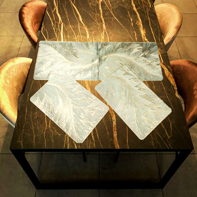 Bring refined elegance to your table setting with our New Gold 3-Piece Mat Set. Featuring a beautiful leaf-inspired pattern with a soft golden shimmer, this set includes one rectangular and two diamond-shaped mats—perfect for adding a decorative and functional touch to dining or side tables.