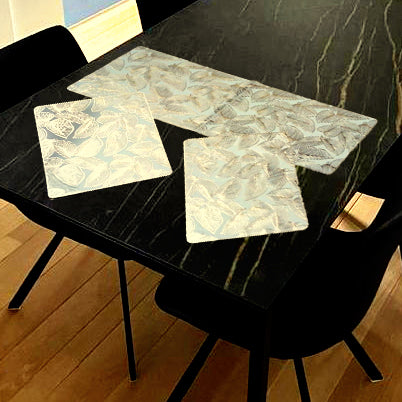 Bring refined elegance to your table setting with our New Gold 3-Piece Mat Set. Featuring a beautiful leaf-inspired pattern with a soft golden shimmer, this set includes one rectangular and two diamond-shaped mats—perfect for adding a decorative and functional touch to dining or side tables.