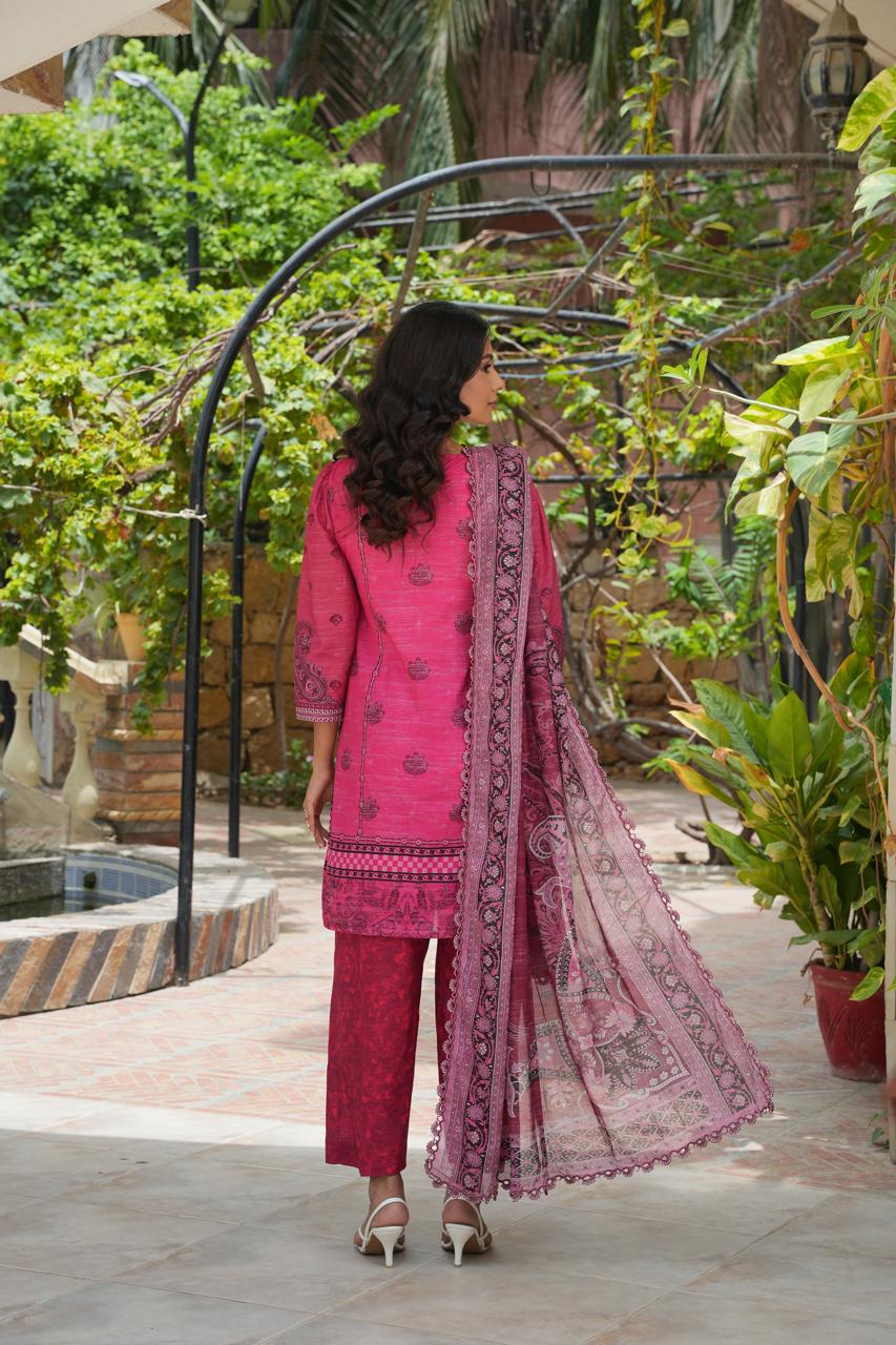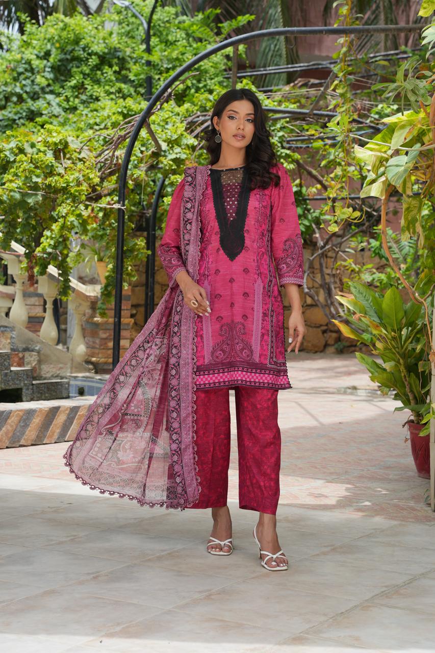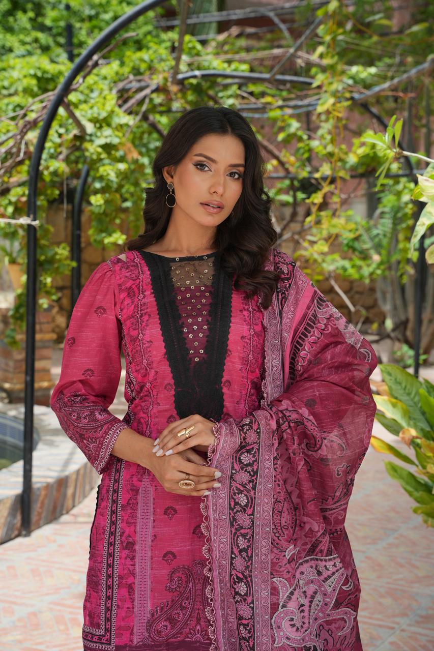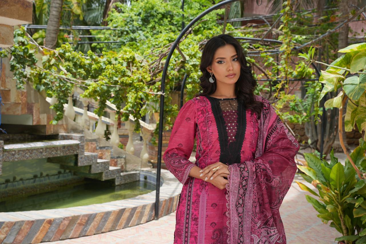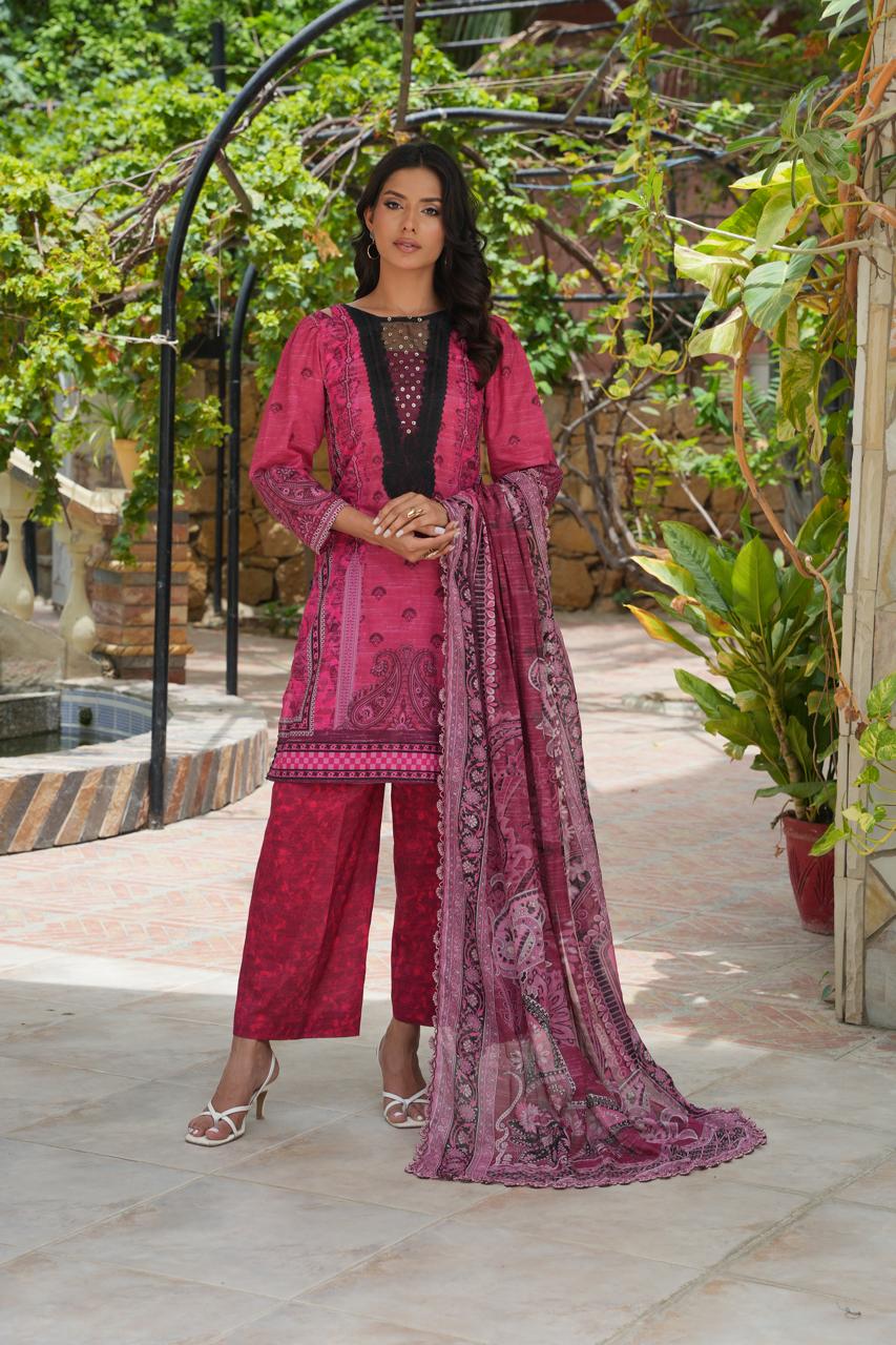 Elevate your summer wardrobe with Pink Ash, a signature 3-piece unstitched suit from the Hira Lari Lawn 2025 Collection. This radiant design celebrates femininity and grace through a vibrant fusion of magenta and rose pink tones, enriched with delicate embroidery on the neckline and intricate digital prints that exude timeless elegance.